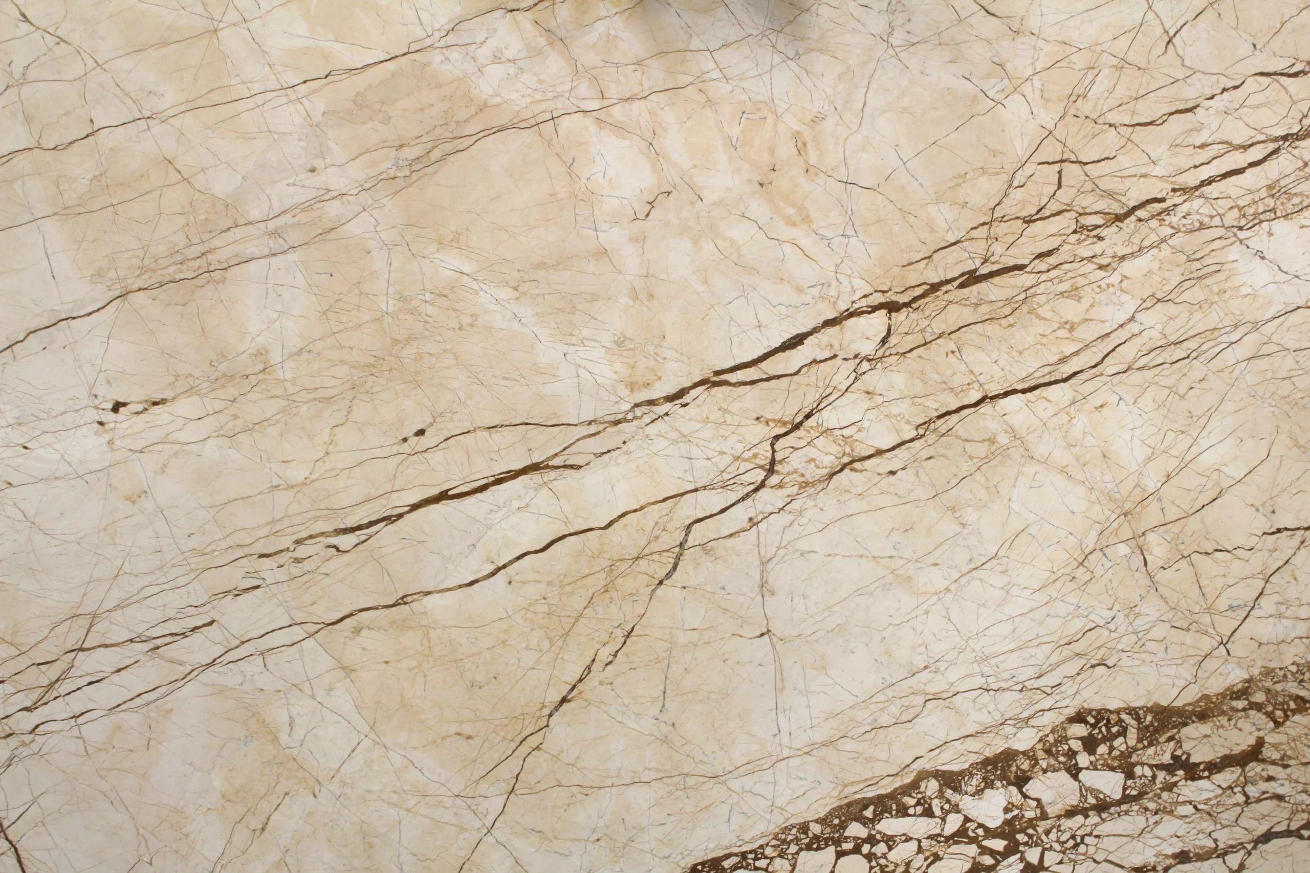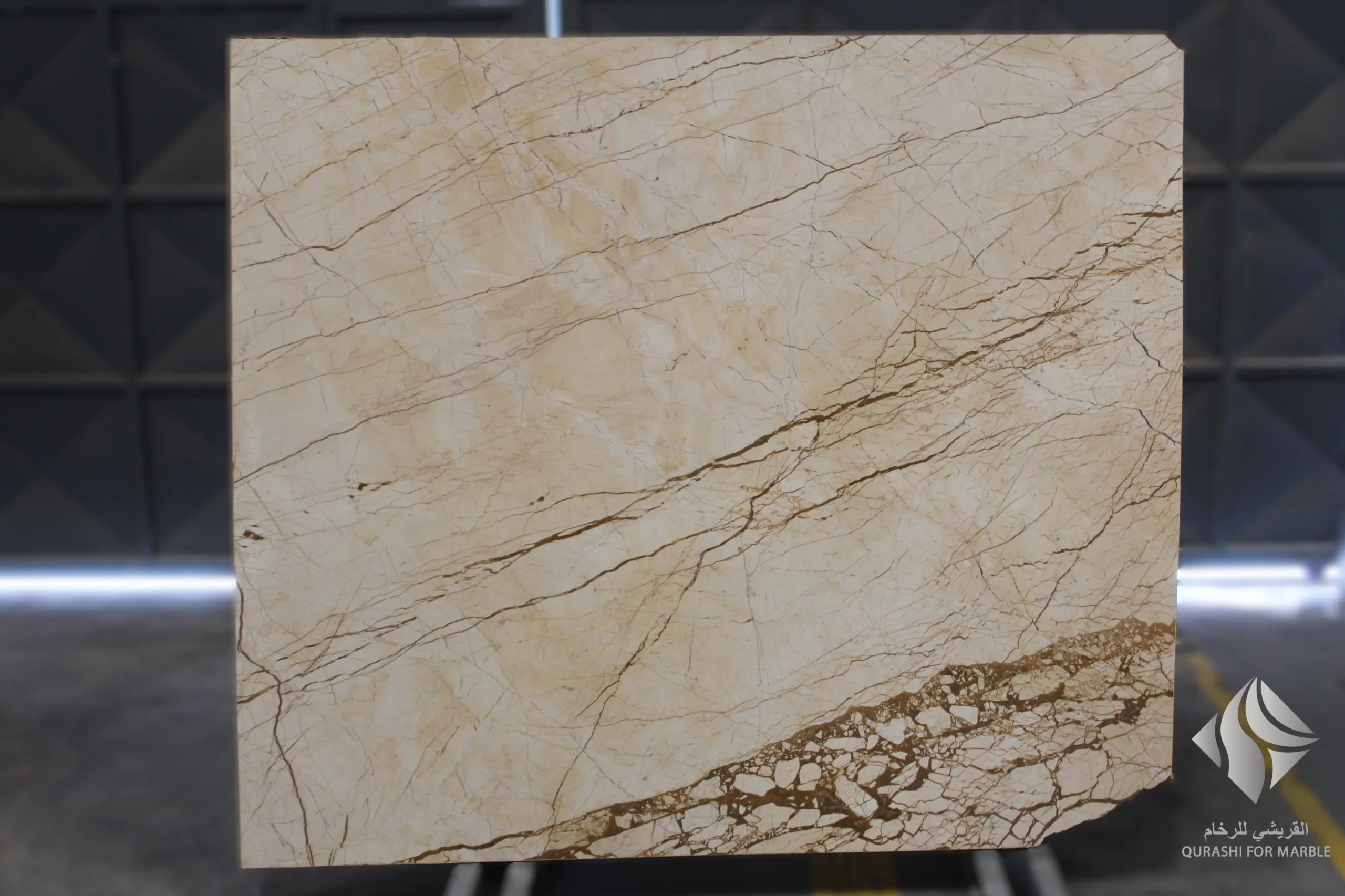 - المظهر: خلفية تتدرج من البيج الفاتح إلى المتوسط مع عروق بيضاء وكريمية دقيقة؛ اللون متناسق مع تباينات طبيعية خفيفة.